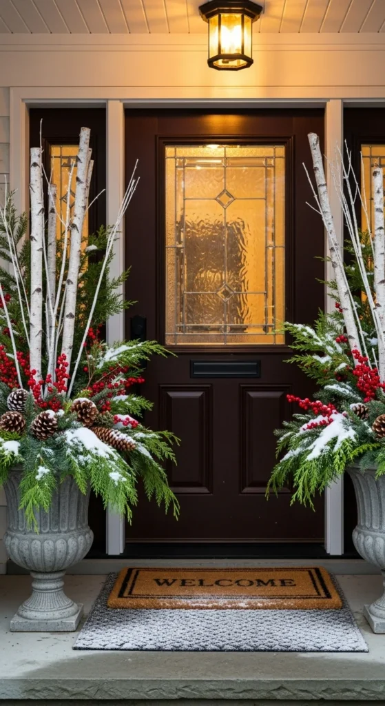 Winter planters instantly frame an entry. Fill outdoor pots with evergreen branches, birch stems, and berry picks. Add pinecones for earthy texture. Keep shapes loose and natural rather than overly uniform. If you want height variation, place taller branches toward the back and shorter stems toward the front. For extra sparkle, tuck battery twinkle lights within branches. This setup works well with both neutral and classic color themes. If you don’t have large planters, use galvanized buckets or baskets lined with plastic inside. Water real greenery lightly to help it last longer outdoors. Add a simple ribbon bow to each planter for finishing touch. This look feels lush and welcoming all season long.