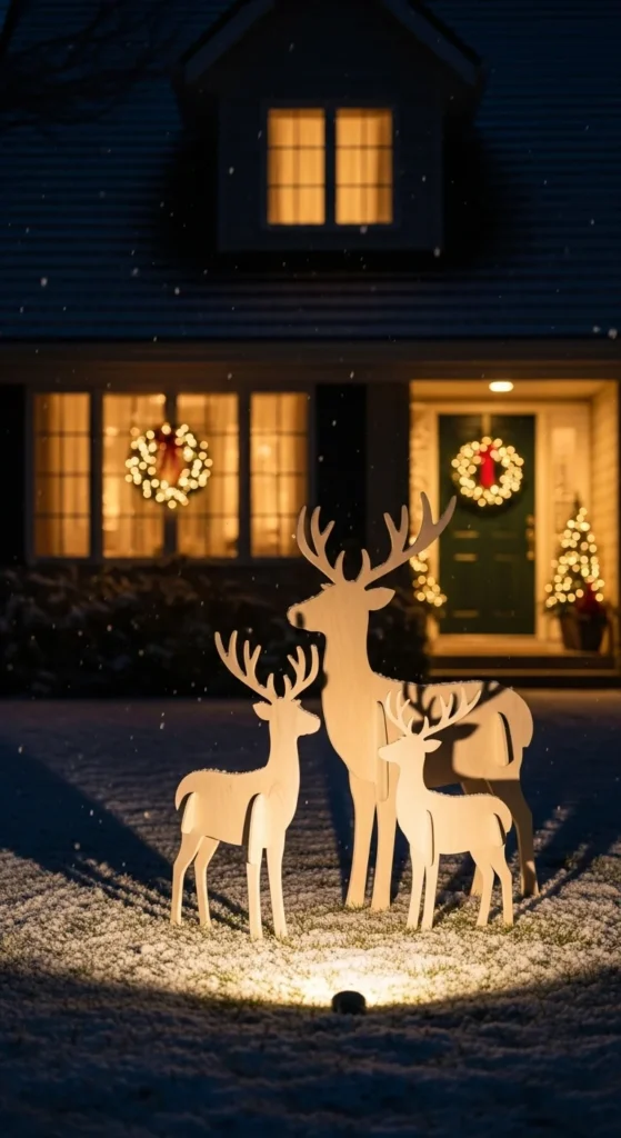 Wood reindeer bring charm to your yard. Place one or two silhouettes on your lawn facing the walkway or porch. Add a spotlight from ground level to highlight shapes at night. Keep surrounding accents minimal so reindeer stand out. If you prefer cozy style, tie thin plaid ribbon around each neck. Many hardware stores sell lightweight versions, or you can cut your own from plywood if crafty. To avoid clutter, pair silhouettes with just a few small lanterns or low pathway lights. Kids enjoy seeing “visitors” waiting by the house. Choose warm light tones instead of bright white for a calm effect.