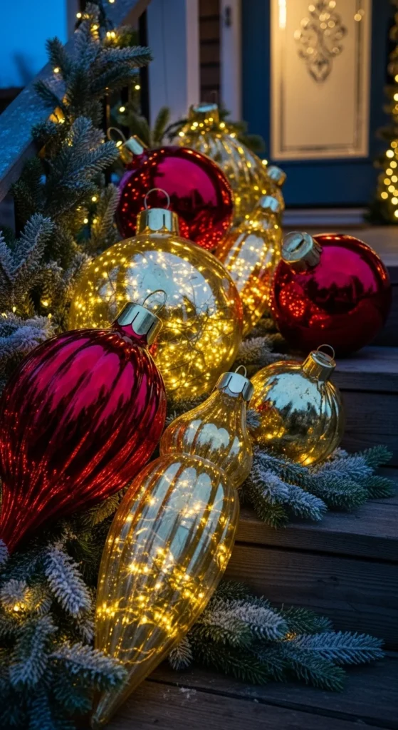 Oversized ornaments look dramatic outside. Cluster them on porch steps or by your walkway. Use a mix of sizes for depth. Tuck evergreen branches around the base to anchor the display. Choose finishes like matte, glossy, and glitter for variation. Stick to two colors if you want a clean look — gold with red or silver with white both work well. If ornaments feel too light, weigh them down inside with stones so wind doesn’t move them. Add a small spotlight to highlight them at night. This feature draws eyes quickly from the street.