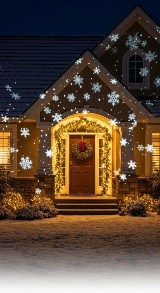 A snowflake projector adds a magical layer without complicated installs. Aim projector at the front facade or yard for soft drifting flakes. Keep movement gentle so display feels elegant. Add warm string lights around the door to ground the effect. If you use this idea, avoid too many bright elements nearby to prevent distraction. Pair with neutrals or single-color greens and whites for cohesive style. Perfect for homes with large front walls or open yards.