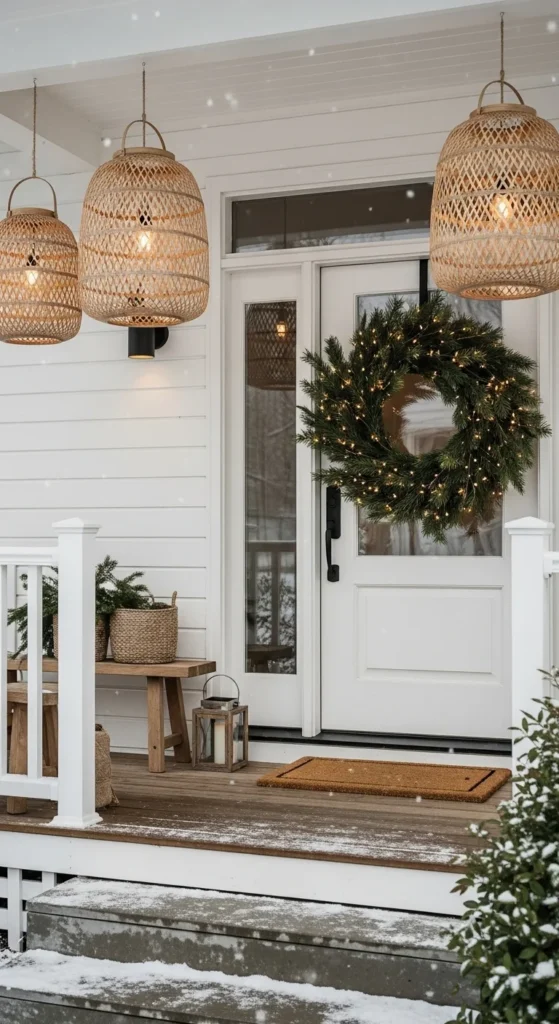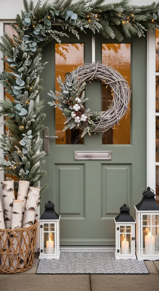 Neutral winter tones feel peaceful. Use flocked garland around the doorway and add pinecones, cotton puffs, and dried stems. Hang a pale wreath with gentle texture rather than bold color. Choose white lanterns or brushed metal lanterns for the floor. Add birch logs in a basket for texture. Keep lights warm, not cool, so the look stays inviting rather than icy. If you need height, set a stack of wrapped “gift” boxes in soft kraft paper on one side. This style works especially well with muted exterior colors and stone or wood finishes.