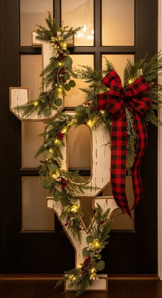 Place large wooden letters spelling JOY by your entry. Tie greenery around each letter and add lights. Set letters slightly off-center instead of perfectly lined up for relaxed charm. Keep background elements minimal so letters remain the star. You can DIY letters from plywood or purchase craft versions. If porch is narrow, place letters stacked vertically instead. Swap colors depending on theme — natural wood for rustic, white for minimal, red for classic. Add one small lantern on each side for balance.