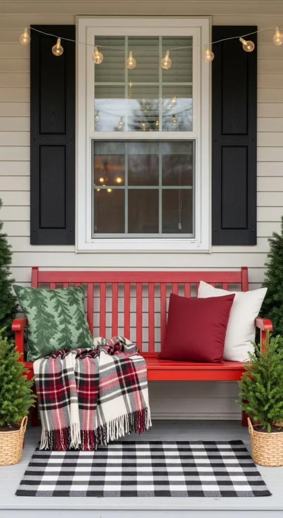If you have a porch bench, treat it as decor centerpiece. Drape a plaid throw across it and place two textured pillows. Add a small potted pine next to legs and a lantern at the other side. Hang simple lights above or wrap along railings. This setup feels welcoming and practical — guests can sit while taking off boots or enjoying cocoa outside. If you don’t have a bench, use a wooden crate as mini seat or plant stand for similar feel. Keep colors cohesive with deep greens and red or muted neutrals.