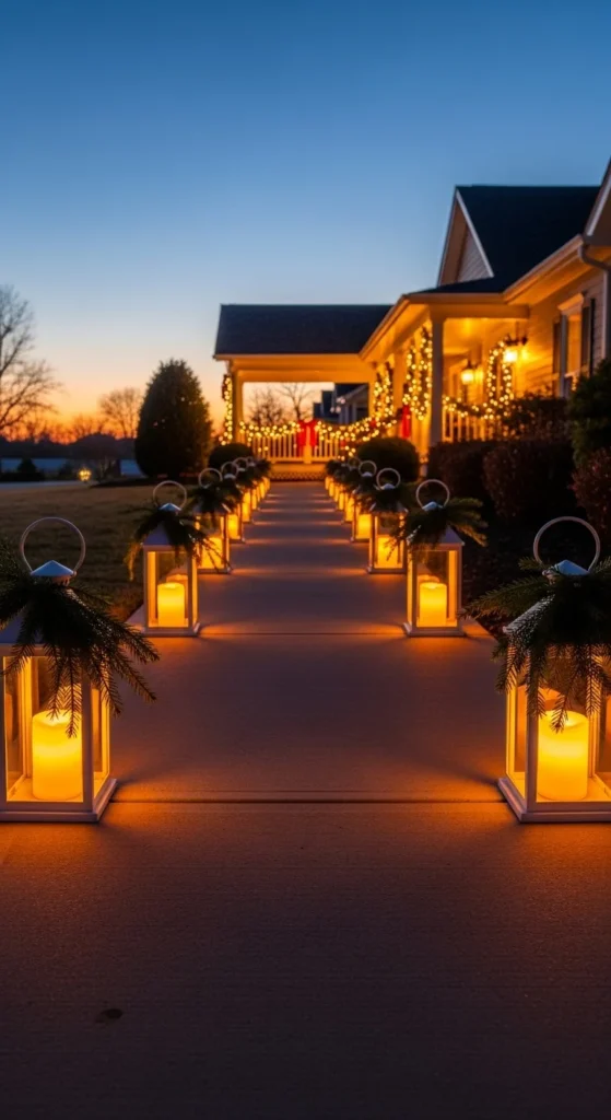 Walkway lighting feels warm and theatrical. Place lanterns along path edges spaced evenly. Use battery candles for safety. Tie small greenery sprigs to each handle for consistency with porch theme. If walkway is long, alternate lanterns with staked lights to maintain spacing affordably. Keep light tone warm. This idea pairs nicely with soft music outdoors during gatherings and gives guests a magical entrance moment.