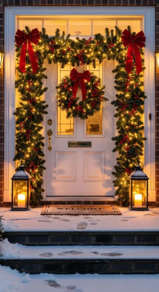Frame your entry with frosted ivy garland if you want soft botanical style. Add tiny white lights so frost glimmers at night. Tuck in little bells or pine sprigs. This style suits stone houses, brick entries, and romantic cottage porches. Keep door decor subtle — a wreath with delicate ribbon pairs well. Add one or two small lanterns for grounding. If your doorway is naturally arched, this style highlights shape beautifully. For square entries, curve garland slightly at top for a gentle drape.
