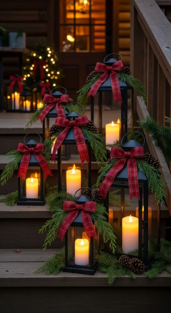 Lanterns work beautifully for layered steps. Arrange lanterns in a staggered pattern leading to the door. Mix sizes for visual interest. Fill bases with pine sprigs, berries, or little ornaments, then place battery candles inside. Add a ribbon bow to each lantern handle if you like soft detail. Scatter pinecones around lantern bases for texture. This look pairs nicely with farmhouse porch furniture or rustic entry materials like brick and wood. Replace lantern bows with plaid for classic charm or velvet for cozy elegance.