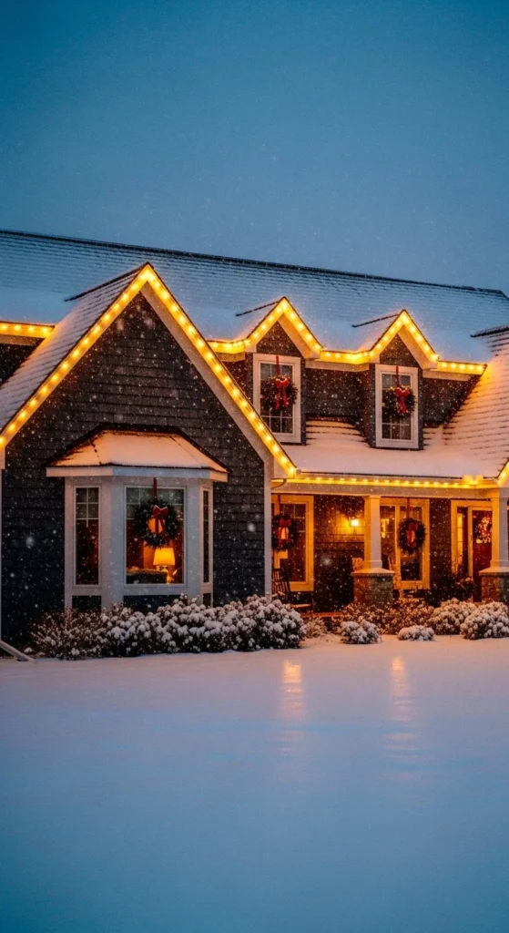 Roofline lighting frames your home and looks stunning from the street. Choose warm bulbs for soft glow. Outline the roof edges and eaves neatly. Keep spacing uniform so lines look clean. Add wreaths to windows with matching ribbon for a balanced style. If you have dormers, give each a small wreath or star ornament. Avoid blinking patterns here; steady light feels classic and calm. If your yard has bushes, place a few light balls beneath to create gentle brightness. This approach suits any home style and lasts all season without feeling busy.
