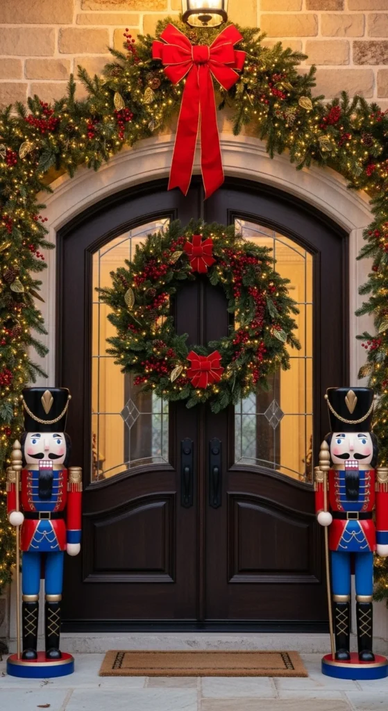 If you want a lively porch greeting, set two nutcracker figures at the door edges. Hang a wreath with a strong ribbon and drape garland overhead. Keep extra accents minimal so nutcrackers remain the standout feature. Add battery spotlights angled upward to highlight them at night. If space is tight, use slightly smaller nutcracker figures or tabletop versions on side tables. This display pairs beautifully with classic red and gold themes.