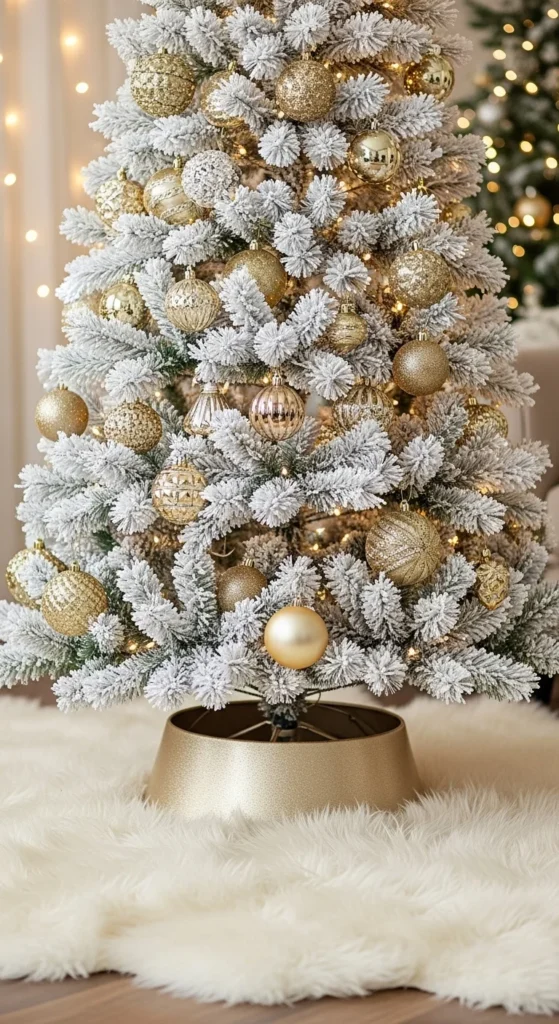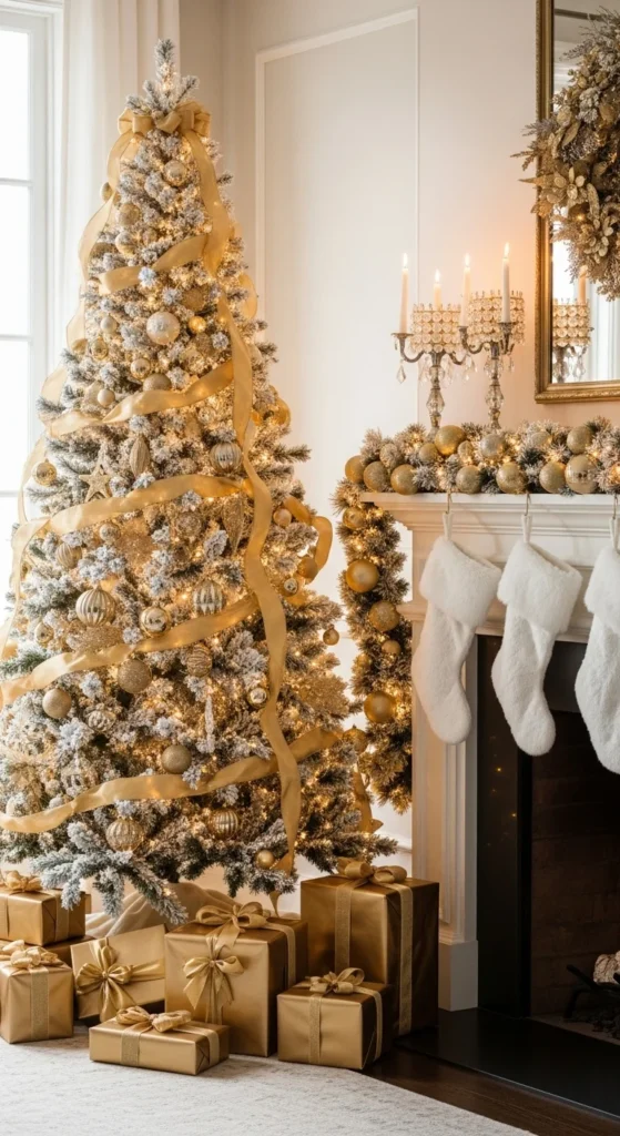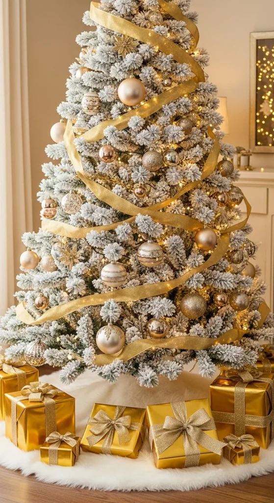 A flocked tree offers dreamy winter softness. Add gold ribbon in long cascading strands for fluid movement. Choose champagne ornaments, soft gold balls, and a touch of pearl finish for variety. Keep the look light by using more ribbon and lights than ornaments. Add a white faux-fur skirt to bring warmth to the base. Tuck a few gold-wrapped boxes underneath for polished styling. If your room is small, pick a pencil tree so the look stays elegant but not overwhelming. Keep decor around the tree minimal so the gold glow remains the focus.