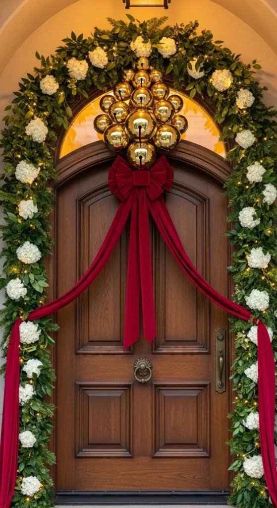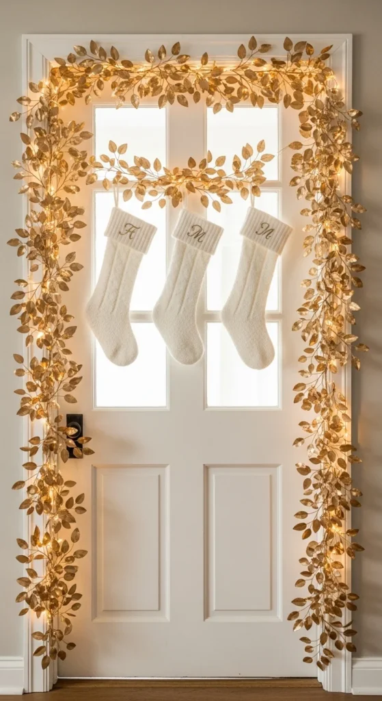 Frame your doorway or mantel with gold leaf garland. Add micro-lights behind for subtle glow. Layer minimal accents below — white stockings, soft faux fur, or small pine bundles. This is clean, modern glam with warmth. Choose matte gold leaves for a gentle shimmer rather than shine.