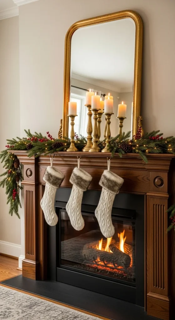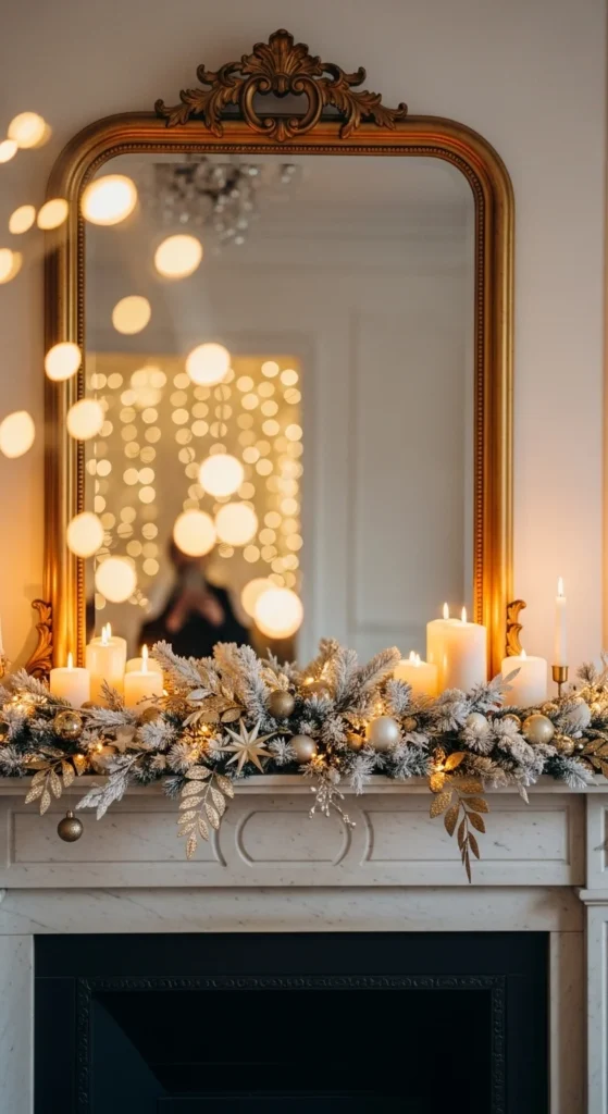 Place a large mirror above your mantel to reflect gold lights and double the glow. Style with a white garland and gold accents, then layer candles in front. The reflection creates a dreamy twinkle effect. Choose a round gold-framed mirror for modern glam or antique white frame for soft vintage style. Keep mantel symmetrical for calm luxury vibes.