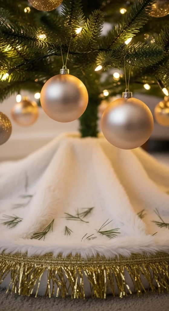 Dress your tree base with a white faux-fur skirt trimmed in gold fringe. It adds soft warmth and sparkle without overpowering. If you already own a plain white skirt, glue a gold ribbon or fringe band along the edge for the same effect. Add three gold-wrapped gifts for balance. This detail ties your room together by grounding the tree in soft luxury. Works well with both flocked and green trees.