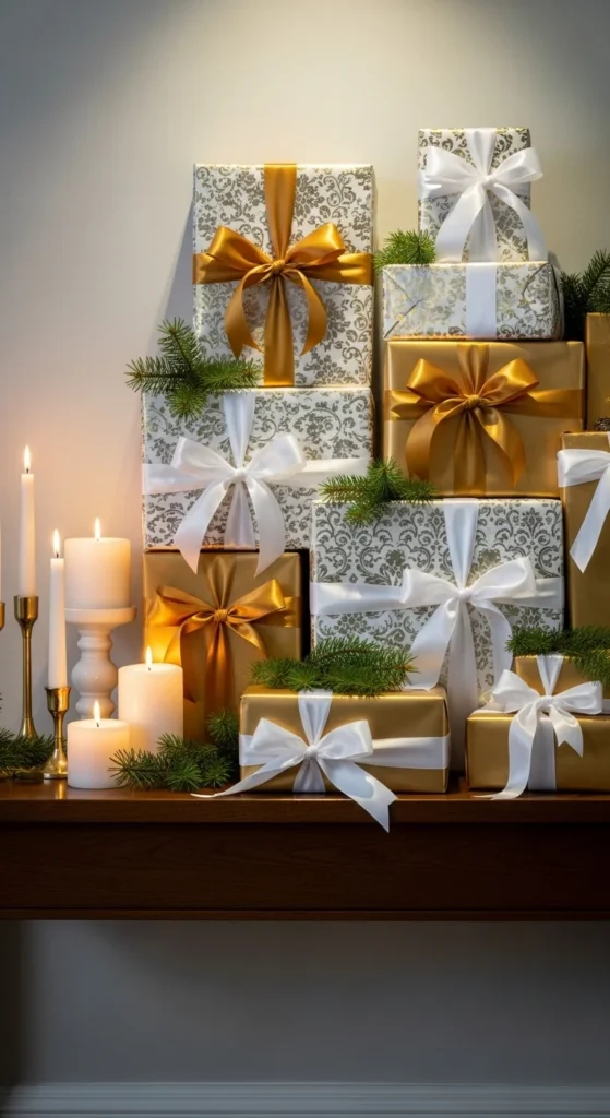 Wrap a few gift boxes in gold and white paper, then tie satin ribbon neatly. Stack them in a corner of your console or under a window. Even empty boxes work — they’re décor. Add one pine sprig or mini bell on the top box for charm. This turns wrapping into sculpture and fills your space with holiday polish. Keep stack small so it feels elegant, not busy.