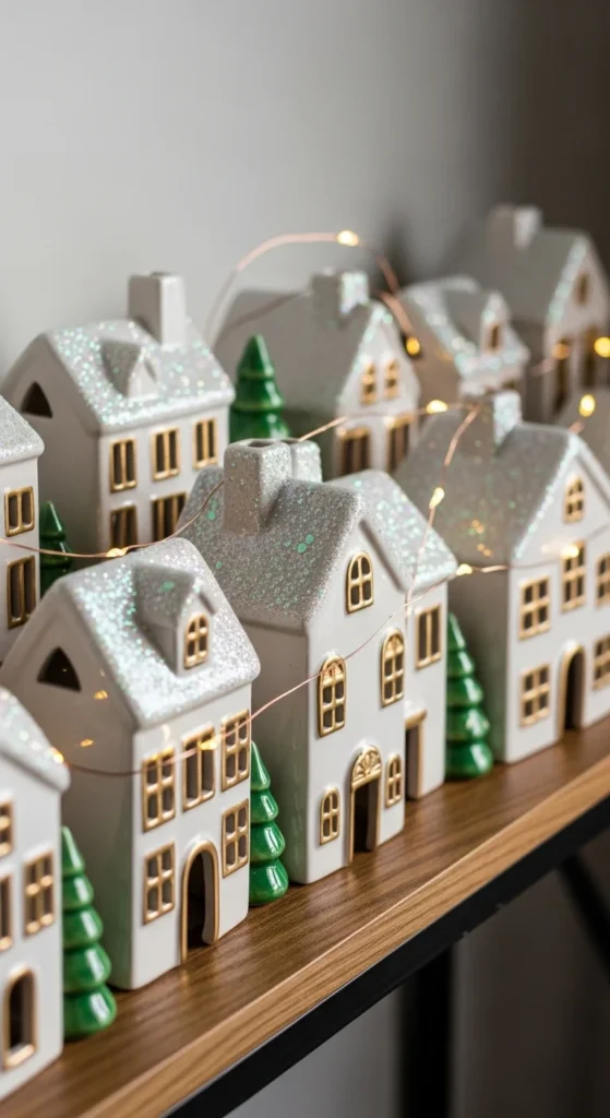 Create a minimalist village scene with white ceramic houses and gold-painted windows. Add soft fairy lights behind them for warm glow. Position tiny bottle-brush trees in white and champagne tones between houses. This setup feels peaceful and magical at night. Works beautifully on floating shelves, buffets, or window sills. Keep the color palette tight: white, gold, warm light.