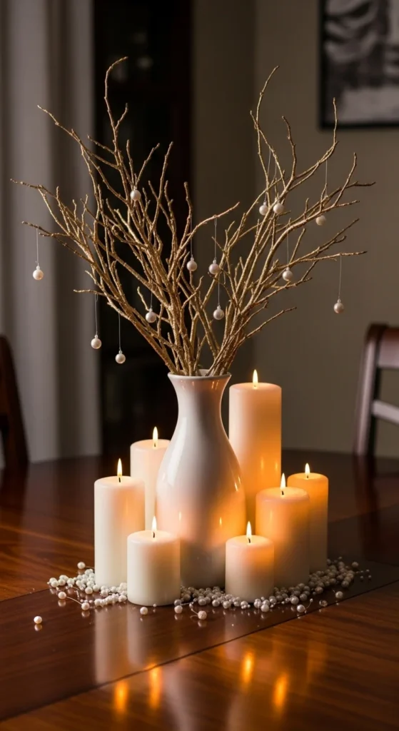 Use frosted candle holders in white or pale gold and group them on your table. Add one gold tray for cohesion and scatter three small white poinsettia stems around base. Warm candlelight through frosted glass creates a snow-soft glow. Incorporate a single pearl bead strand if you want subtle movement.
