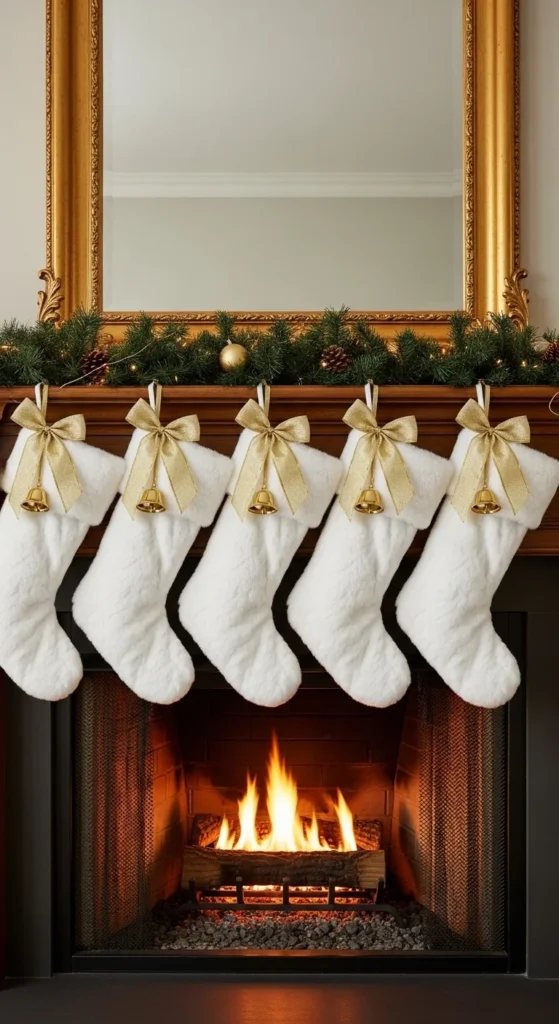 Hang white faux-fur stockings trimmed in gold ribbon. Tie gold bells near the top for a soft jingle and metallic accent. If you already have plain white stockings, simply sew or glue gold trim. Add a velvet bow above each for warmth. This keeps your mantel cohesive while adding plush comfort.