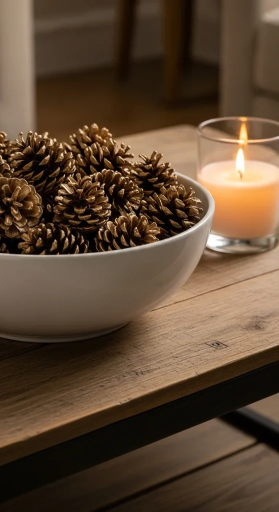 Collect pinecones and mist the tips with gold spray. Drop into a ceramic bowl and display on your table. Add a loose satin ribbon tail for a chic touch. This mix of nature and metallic works in both rustic luxe and modern glam homes. In smaller spaces, use a smaller bowl or glass jar to keep things light.
