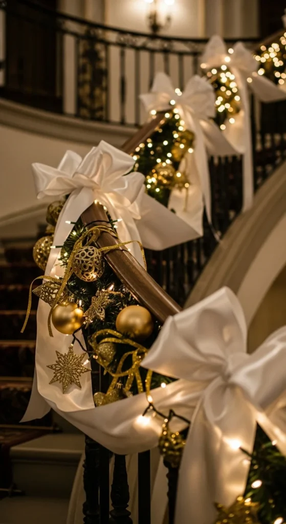 Wrap a wide white satin ribbon loosely along your banister. Tie gold ornaments or little bell clusters at intervals. This creates elegant movement and a soft winter glow when paired with twinkle lights. Satin brings a hotel-suite feel to your space. Avoid thick garlands if you want a sleek, airy finish.