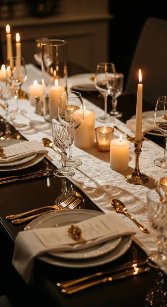 Lay a white velvet runner down your table and pair with gold flatware. This pairing instantly shifts your dining area into winter luxury mode. Add crystal glassware and simple white plates for a calm base. Finish with one floral center cluster — white roses or baby’s breath — plus a few gold votives. Understated yet rich.