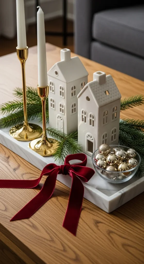 Style a marble tray with gold accents for a chic table centerpiece. Add one gold candleholder, a few white ceramic houses, and a bowl of mini ornaments. Finish with a velvet ribbon draped softly and two pine sprigs. Keep colors tight — white, gold, greenery. This brings a luxe look without losing practicality. When guests arrive, lift tray easily and open table space. Perfect for small apartments or busy households.