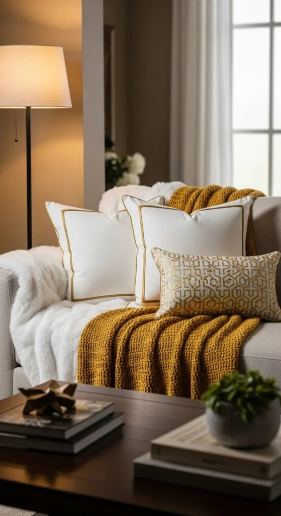 Layer throws to create warmth and shine. Start with a soft faux-fur base, then top with a gold knit throw. Add pillows with gold piping or sequins, but keep count minimal. Aim for one anchor pillow and one accent pillow per side. This approach turns your everyday sofa into a cozy holiday perch. If you prefer subtle shimmer, choose metallic thread fabric instead of sequins. Always ground sparkle with soft textures to avoid glare or visual clutter.