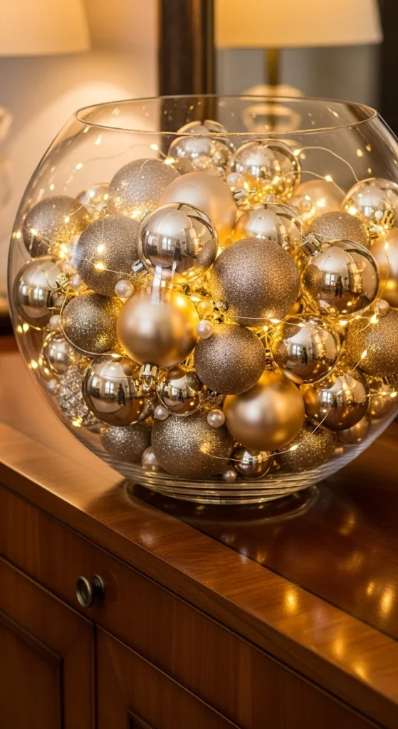 Fill a glass bowl with champagne ornaments and nestle a micro-light strand inside. Add pearl beads or gold stars to vary texture. The gentle glow turns this into a sculptural accent. Place on a console, island, or shelf. It takes seconds to assemble and looks high-end. If you want a budget option, mix dollar-store ornaments with ribbon scraps and pinecones for richness. Keep bowl shape simple — rounded clear glass works best.