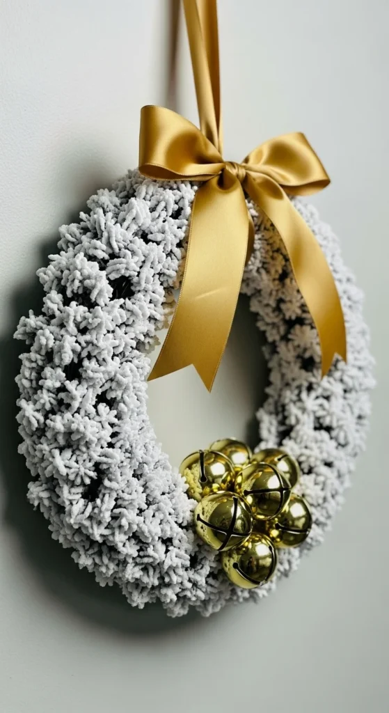 Choose a frosted wreath and tie with satin gold ribbon. Add medium bells in the center for a classy focal point. Hang above a fireplace, bed, or entry table. Keep surrounding décor minimal so the wreath shines. This piece feels like winter elegance in one statement. For a more organic touch, mix in eucalyptus stems. Avoid bold color here — let soft green and gold work naturally.