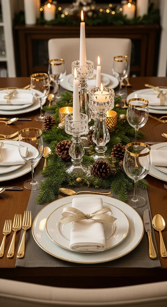 Set your dining table with crystal candleholders and an evergreen runner for festive sparkle. Use white plates and gold flatware for a clean, regal look. Tie napkins with thin gold ribbon. Add one gold ornament to each setting as a small guest gift. This keeps the space glamorous while still welcoming. If you don’t plan to dine daily at this setup, use faux greenery for easy upkeep.