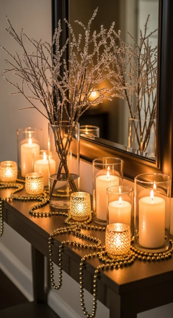 Drape a gold bead garland across your console table to add shine. Place tall clear vases with frosted branches beside it. Add two candles on small gold trays. This combination feels airy and elegant. Mirrors amplify the gold shimmer, so if you have one above your console, even better. Keep line work clean — one garland, two vases, and symmetrical candles finish the scene.