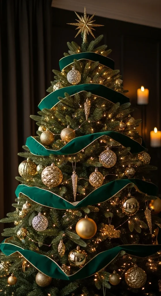 This tree style uses emerald velvet ribbon as the star. Cut ribbon into long pieces and cascade them loosely from top to bottom, letting them fall naturally. Add gold ornaments in different finishes — matte, shiny, and glitter — for contrast. Use warm fairy lights to soften the deep green. For a low-budget approach, mix real velvet with faux ribbon. You can also spray-paint inexpensive ornaments gold for a luxe look. Finish with a gold star or crown topper. A velvet tree skirt adds richness. Velvet bows tied on branches bring a boutique feel and turn even a small tree into a regal moment. Keep your ornament palette simple — emerald, gold, and clear glass. Store ribbon rolls for next year since this decor feels timeless, not trendy. Stick to cohesive tones to keep the theme strong.