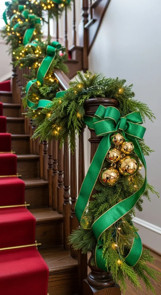 Wrap your staircase with greenery and add velvet ribbon. Tie gold bells at the base or every few feet. This gives your entry a dramatic royal look. Use zip ties for easy removal and reuse each season. If stairs are minimal, hang ribbon bows spaced evenly for subtle decor. Add flameless candles on steps for evening glow. Keep steps clear for safety.