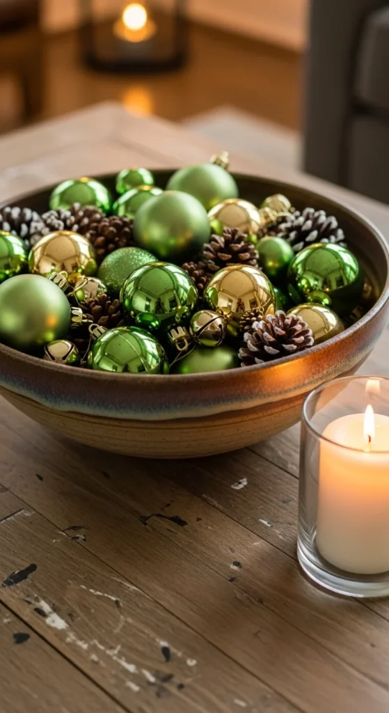 A bowl filled with ornaments works beautifully on tables and shelves. Mix matte and shiny textures. Add pinecones and miniature gold bells. Use bowls you already own — ceramic, glass, or wood. Velvet ribbon pieces tied around a few ornaments create a custom feel. This is one of the fastest ways to add holiday style to any room.