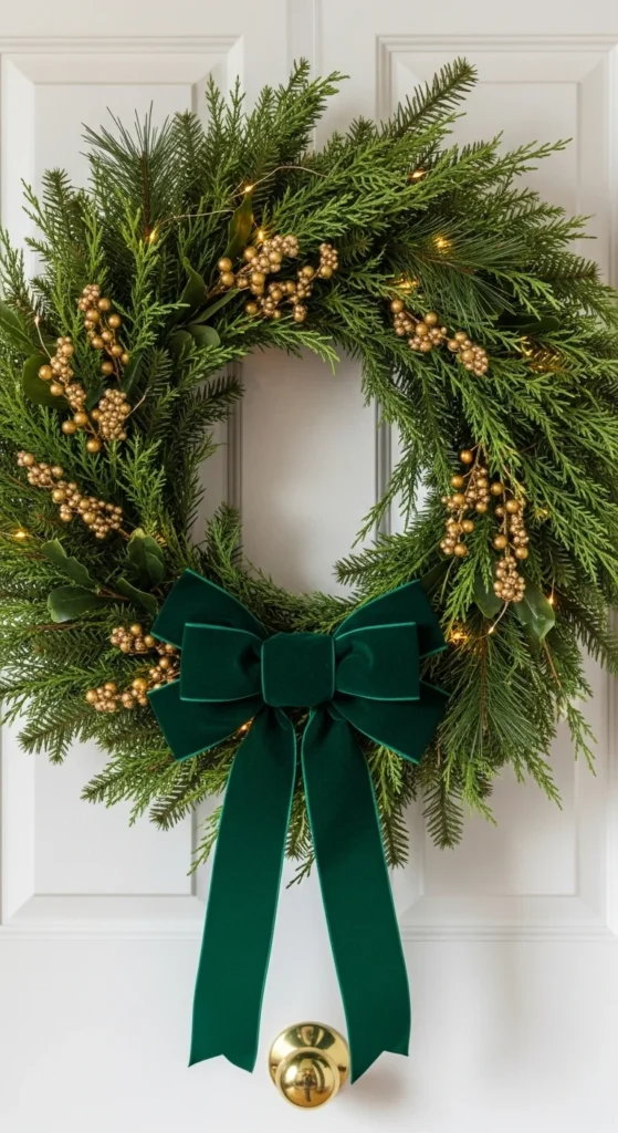 A wreath with a large velvet bow sets the theme right at your door. Add gold berry stems or spray pinecones gold. Battery fairy lights add evening charm. This look suits both traditional and modern doors. Create a mini matching wreath for interior mirrors or cabinets to keep design cohesive.