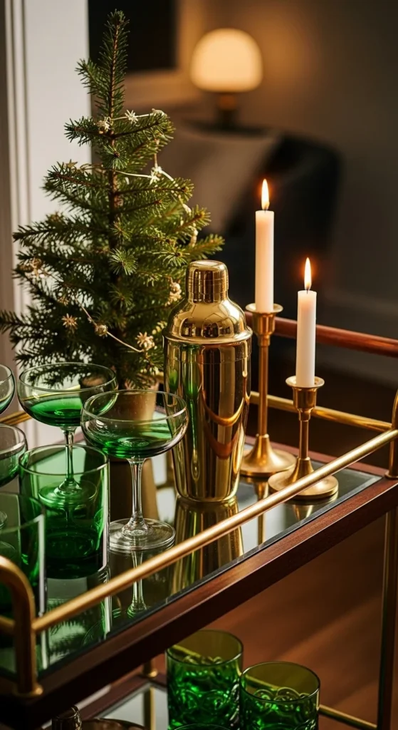 Style a bar cart with green glassware or bottles. Add gold drink accessories and a small tabletop tree. Gold coasters or cocktail napkins complete the moment. Use thrift-store glassware if needed. This works even if you don’t drink — use it as a holiday cocoa bar or sparkling water station.