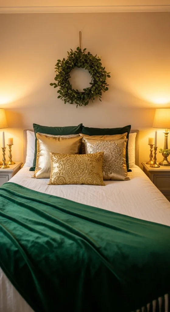 Add emerald throw blankets and gold pillows to your bed. Place a small wreath above the headboard. Switch lampshades to warm-toned ones for glow. Drape gold ribbon on your nightstand lamp for subtle flair. Keep it soft and cozy so the bedroom stays peaceful, not busy. Faux fur also pairs well with velvet.