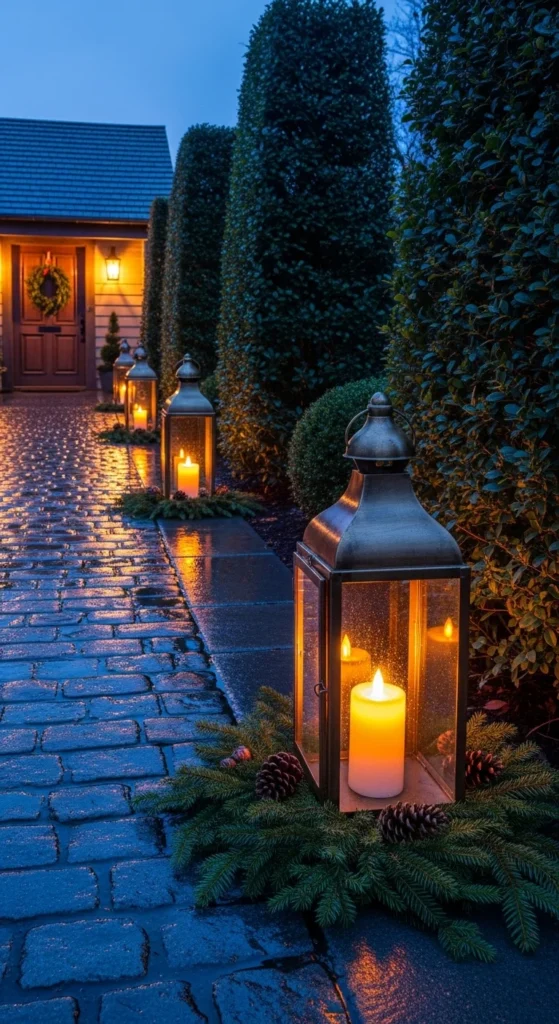 Use lanterns with LED candles along your walkway or entry hall. Add evergreen sprigs around the base for fullness. Metallic lanterns instantly feel regal. Battery candles with timers are easy and safe. If outside, make sure pieces are weather-safe or bring indoors overnight.