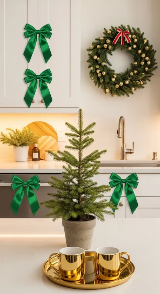 Keep your kitchen simple. Add ribbon bows to cabinet handles, a mini wreath near the sink, and gold mugs on a tray. Swap dish towels for deep green ones. Add a small pine or rosemary plant. This keeps cooking areas functional yet festive.