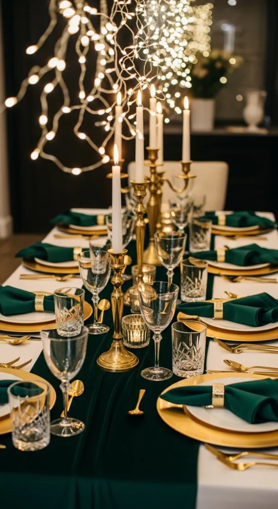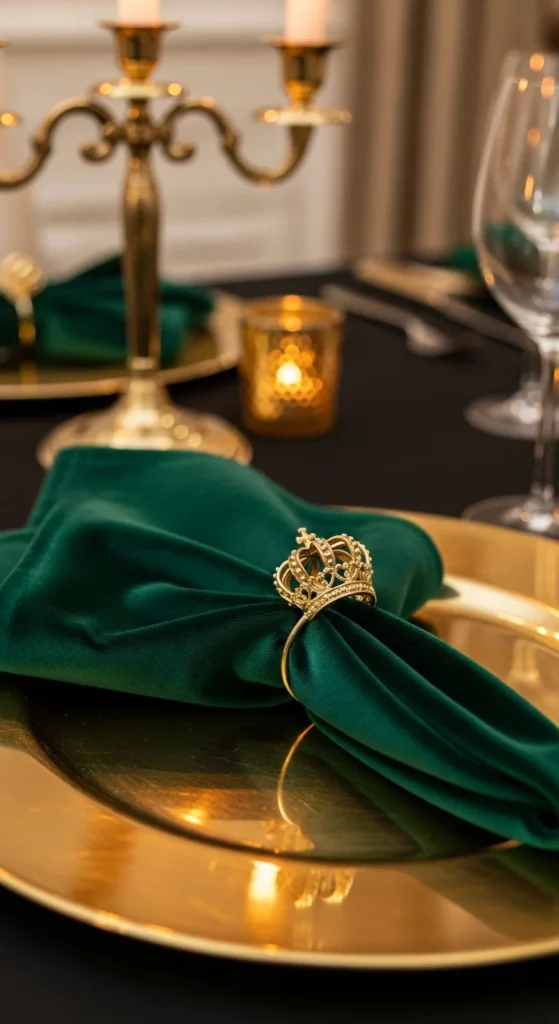 Use tiny crown charms or rings for napkins. Tie napkins with green velvet ribbon and attach charms. This tiny touch feels thoughtful. Pair with gold chargers and simple white dishes. Add a sprig of rosemary for scent and elegance.