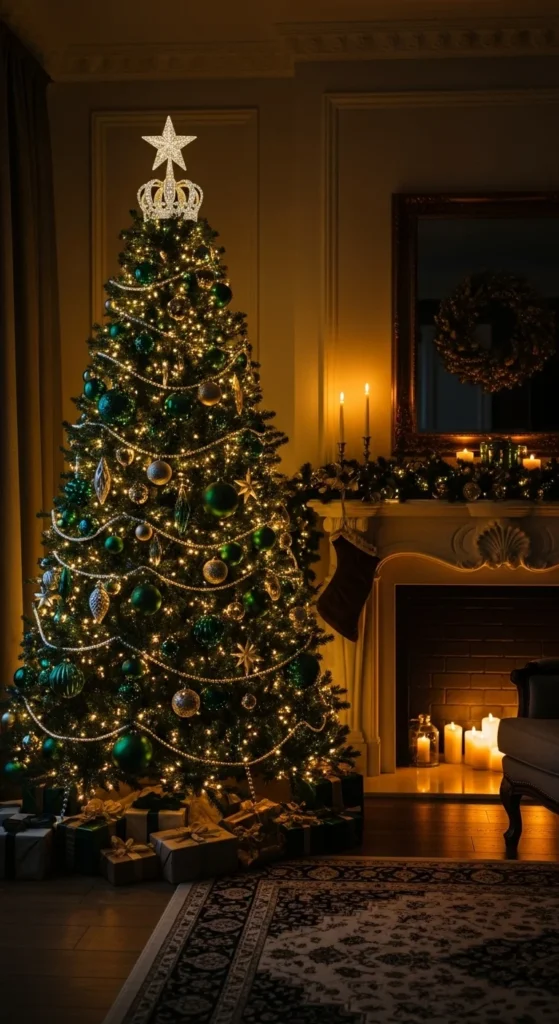 Swap your star for a gold crown topper for a royal moment. You can find crown decor at craft stores or thrift shops and spray-paint it gold if needed. Place it securely at the top using floral wire or zip ties. Add pearl strands to complement the regal touch. Simple DIY: use a small metal planter turned upside down, add faux jewels, and paint it antique gold. This instantly creates a palace-style look without spending much. Pair with rich green ornaments and gold bead garland. The crown gives your tree story and personality. It works beautifully in traditional homes, Victorian-inspired rooms, or glam spaces. Keep other tree elements soft so the topper shines.