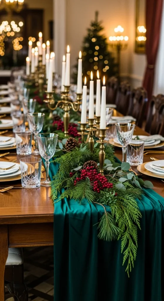 Velvet runners feel royal. Layer gold candlesticks and simple greenery. Sprinkle small ornaments between candles. For small tables, fold runner into a centered strip. Add linen napkins with gold ribbon ties. Reuse velvet remnant from fabric stores to save money.