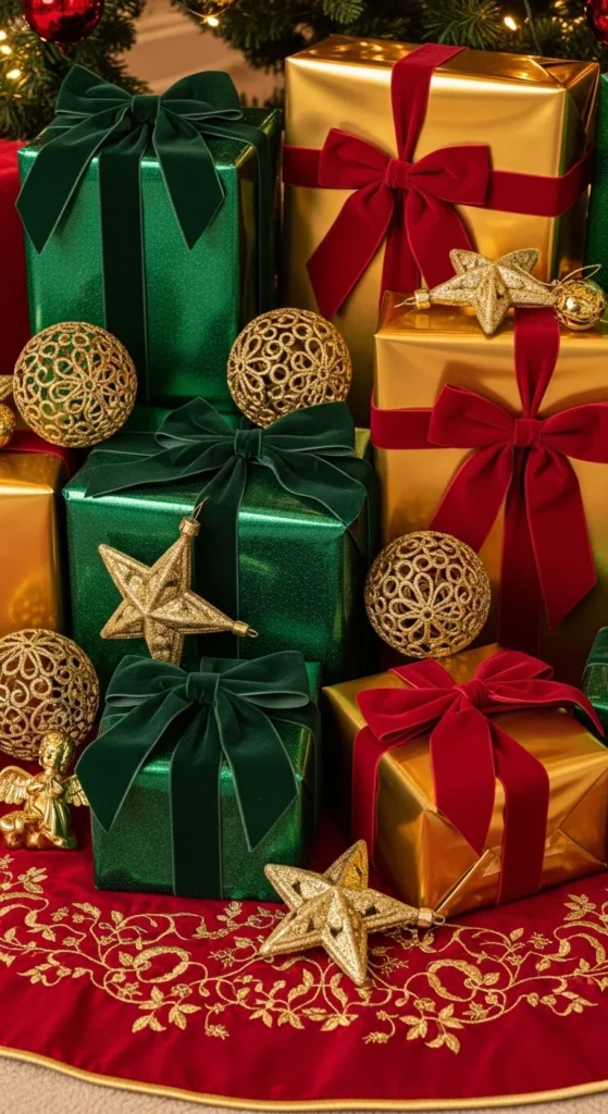 Wrap presents early in matching tones. Choose satin or velvet ribbon. Add greenery sprigs to each gift. Stack gifts at different angles under the tree for fullness. Cheap DIY: reuse old boxes and wrap with fabric scraps. Presents become decoration.