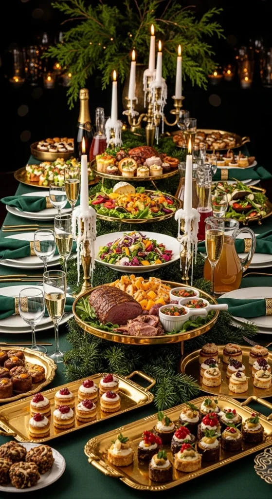 Use gold trays for snacks and drinks. Add green napkins and simple candleholders. Place small pine branches around dishes. Keep food simple — cheese, fruit, nuts — arranged neatly. Decorative but easy.