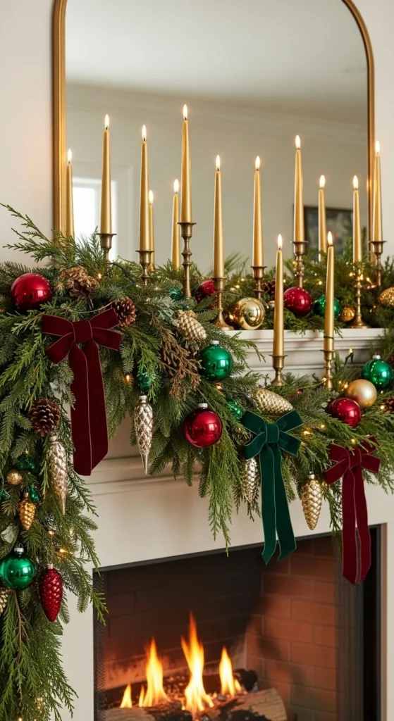 Line your mantel with gold taper candles in simple brass holders. Place greenery garland underneath — real or faux. Wrap it with warm fairy lights, and tuck in gold ornaments or gold-dipped pinecones. Velvet bows in emerald or hunter green bring depth. Dollar-store taper candles painted gold also work. Just spray evenly and dry fully. Stagger candle heights for drama and warmth. If you worry about safety, use battery taper candles — they look real now and avoid dripping wax. This setup feels like a castle holiday moment, especially with a fireplace glowing below. Add simple stocking hooks and rich velvet stockings for finishing texture. A few gold bells layered into the garland add a charming detail.