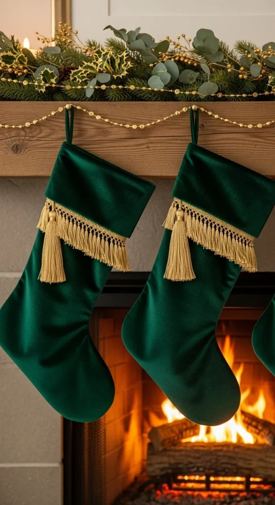 Velvet stockings bring luxury instantly. Look for deep emerald or forest tones. Add gold tassels or monogram letters for personalization. You can DIY by sewing tassels to budget-friendly stockings or using iron-on initials in gold. For renters, use stocking hangers to avoid nails. Place gold bells or ribbon loops on each stocking for detail. Pair with matching garland or ribbon bow accents. If you have pets or kids, choose sturdy lining fabric so stockings last. This small switch changes the whole feeling of your fireplace.