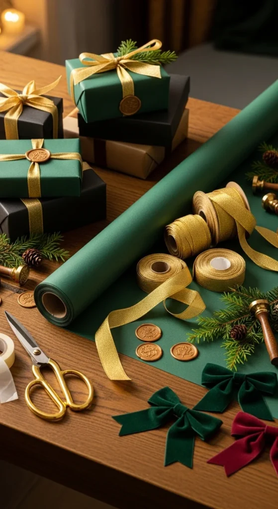 Gift wrap becomes part of the decor. Pick green paper, gold ribbon, and simple kraft boxes. Add sprigs of pine or faux greenery under ribbon for natural elegance. Wax seals in gold look high-end but are easy to make with a sealing stamp set. Use leftover fabric ribbon for a boutique wrapped look. Keep everything in a basket or tray near your tree for pretty styling. Wrapping this way brings harmony to your decor and doubles as display.