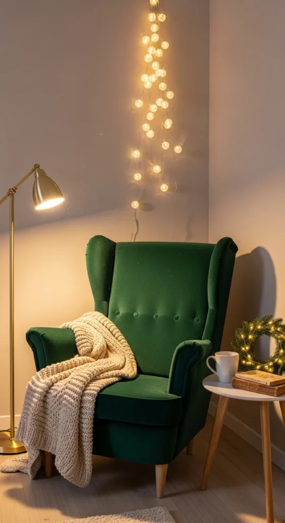 Create a cozy holiday nook with an emerald chair or slipcover. Add a gold pillow or throw blanket. Place a gold side table with a candle and a small wreath for layered charm. If you don’t own an emerald chair, add a velvet throw draped over a neutral seat. Use battery lights nearby for a soft glow. This corner becomes a reading or hot cocoa moment with royalty vibes. Perfect for small apartments.