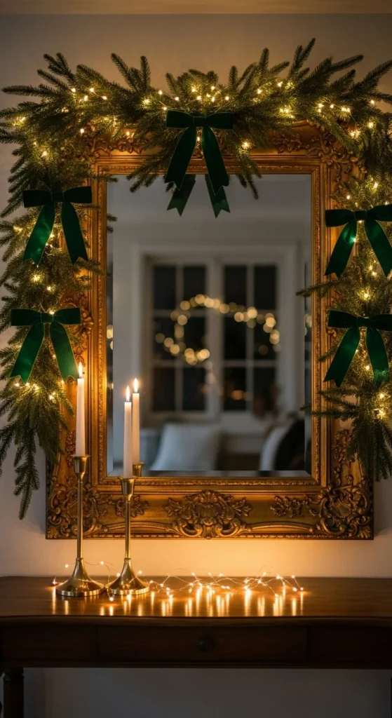A gold mirror becomes a centerpiece for your regal theme. Hang or lean it above your console or fireplace. Add garland and ribbon around it. Soft lights reflect beautifully, doubling sparkle. Thrift mirrors often have ornate frames perfect for spray painting gold if needed. Add candlesticks in front for layered holiday charm. This setup feels classic and dramatic, yet easy to achieve.