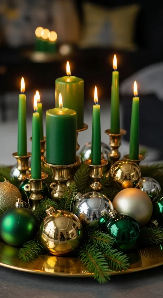 Use candles in emerald and gold tones. Place them on a tray with evergreen sprigs and ornaments. Battery candles allow worry-free glow. Set this on a coffee table, entry console, or dining buffet. Layer heights for interest. You can wrap plain candles with velvet ribbon and attach a gold charm. It’s simple and chic. Keep scents light and neutral so they don’t compete.