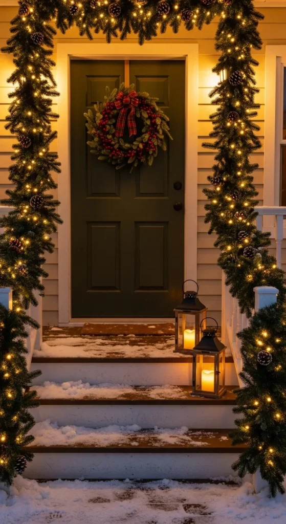 Wrap railings and porch posts in lush green garland. Add warm fairy lights for sparkle. Tuck faux berries, pinecones, and ribbon into the greens. A simple DIY garland hack: combine dollar-store greenery with fresh pine cuttings for fullness. Clip with zip ties to secure. Hang a big wreath on your front door and place lanterns on each side with battery candles. If you like a traditional look, stick to warm white lights and red ribbons. For a softer style, go with gold ribbons and neutral tones. Keep decor balanced instead of overcrowded. A porch chair with a plaid pillow finishes the entry. This setup works for small or large porches. You can even add a mini Christmas tree by the door to frame the entrance.
