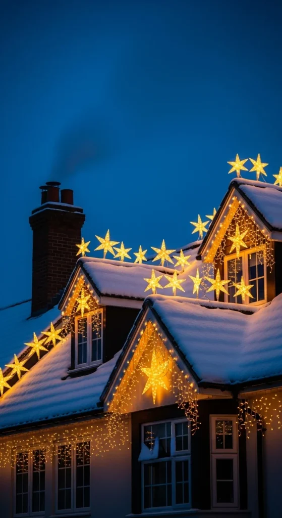 Hang star-shaped lights along your roofline instead of standard string lights. Mix two or three sizes for interest. Keep consistent spacing for a neat look. These stars appear magical against winter skies. You can also hang a few from tree branches in front yard areas. Use plastic clips to protect gutters. Battery-powered stars work on balconies or patios with no outlets.